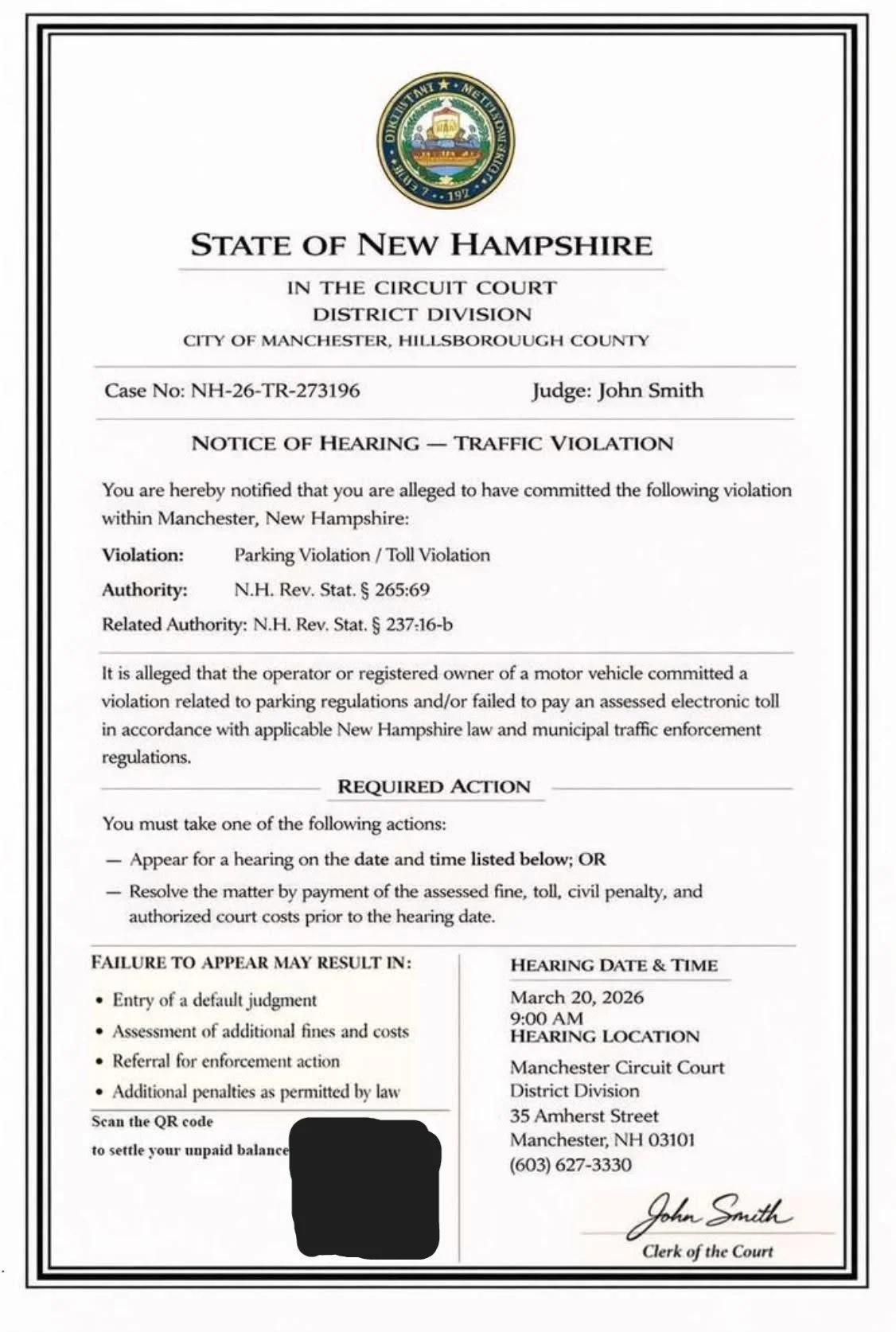 The scam appears in the form of a very realistic-looking “Notice of Hearing,” which falsely claims the recipient committed a traffic violation and owes a fine. The document also indicates a
